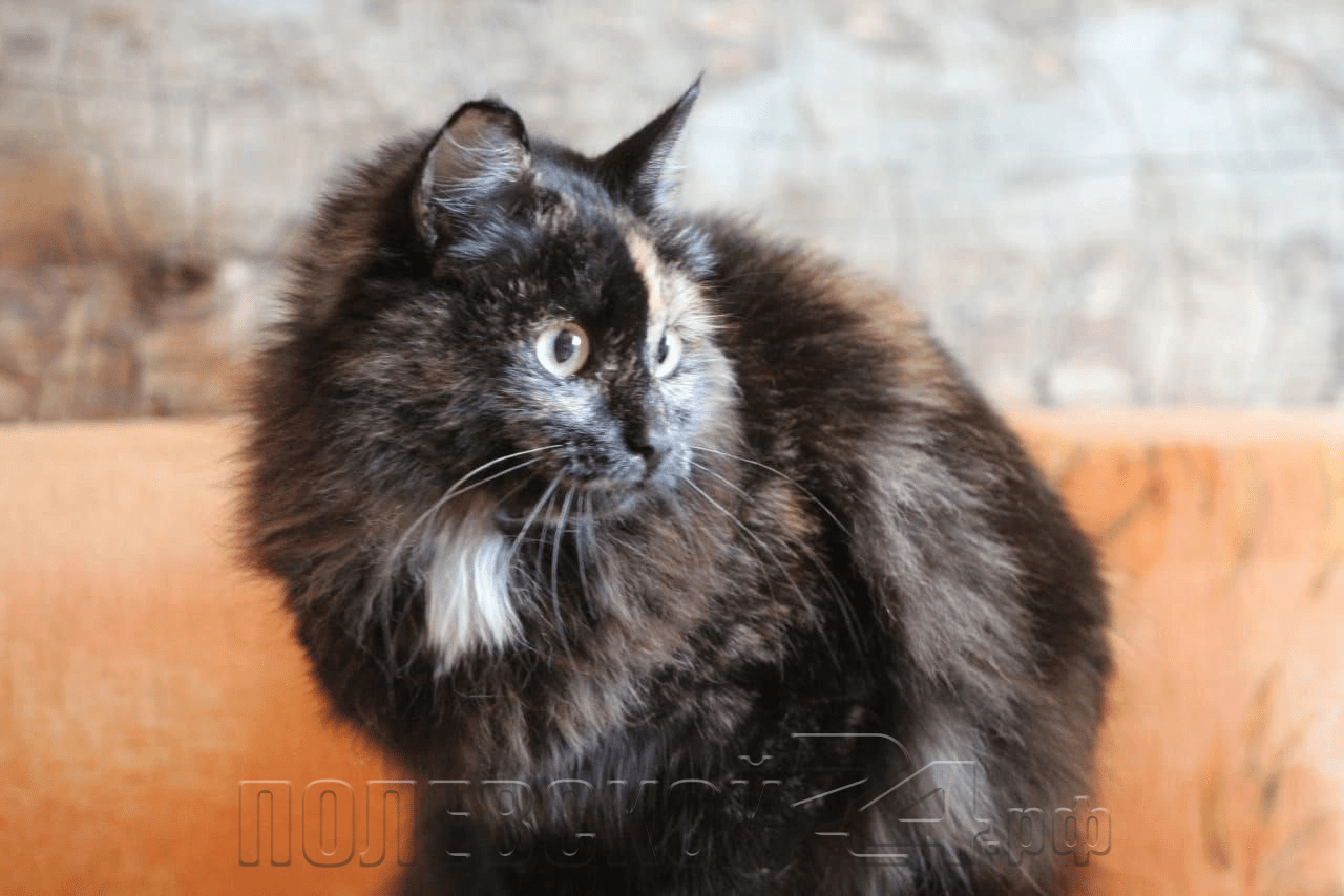 У Чучи причудливый черепаховый окрас и белое пятнышко на груди, а ещё она очень пушистая, но сама умеет ухаживать за своей шубкой.